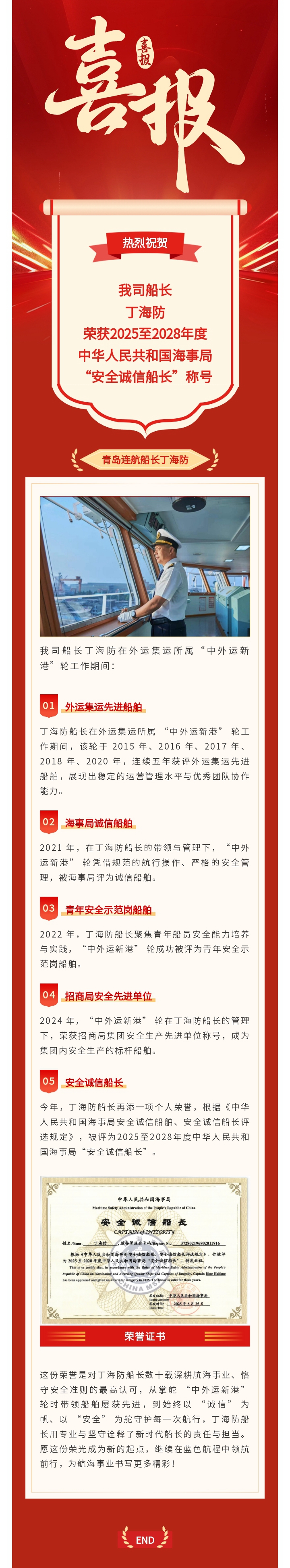我司船長(zhǎng)丁海防榮獲“安全誠(chéng)信船長(zhǎng)”稱號(hào)